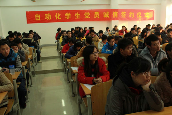 临近期末,为了在全院营造诚信考试氛围,树立良好考风,充分发挥学生党员的先锋模范带头作用,18jav 在本月初启动了学生党员学风考风示范月活动,并于12月14日下午在教四409举行了系列活动之一学生党员诚信签约仪式。学院党委副书记高志华老师、党委组织员陈素兰老师、分团委书记叶晓勤老师和2009级辅导员赵梓竹老师以及全体研究生和本科生学生党员参加了签约仪式。