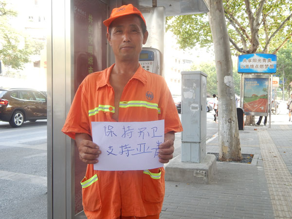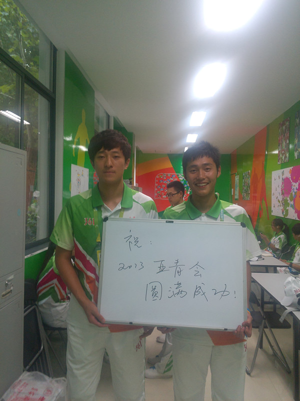 在亚青会期间,志愿者们心中的梦想就是‘为亚青奉献,为祖国加油’。他们在自己的岗位上共同祝福着亚青会,“激情盛夏,亚青邮我”这是他们的誓言,“共祝亚青会圆满成功”这是他们的祝愿。无私无悔的身影,他们同样最美。