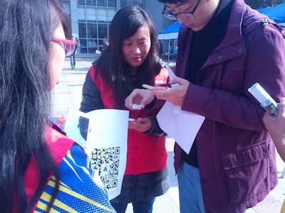 为吸引更多的人参加这项活动,在活动举办前,爱心社就已在人人、微博及微信上作宣传推送。活动一开始,爱心社主席及各部门的中干积极做好现场安排与引导,为部员提供榜样与鼓励,各部门干事在主席及中干的指导与帮助下,极力向过往的同学宣传此次活动的意义。经简单讲解,同学们通过一个简单的手机应用录入自己的信息,并且把相应的二维码贴在自己的饭卡、课本等易丢物品上,这样便可以让拾到丢失物品的人扫出物品的主人信息以及时归还,充分满足了同学们的需要。活动期间,许多同学前来了解并关注爱心社微信,以及贴扫二维码。在爱心社全体部员的努力下,活动举办的新颖而又独特,前来参加的人络绎不绝,活动一直持续到傍晚才结束。