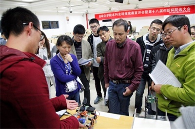 大会第一项,主持人宣布宣讲会开始,介绍到场嘉宾。此次出席的嘉宾阵容强大,充分体现了18jav 对此次大会的重视程度。大会第二项,由高翔院长和杜月林书记进行讲话。两位院领导深度总结了18jav 过去取得的骄人成绩,同时给出现阶段的科技发展任务,包括Robcup机器人大赛、飞思卡尔竞赛及大学生电子设计大赛等。至此,宣讲会结束,创新杯院赛开始。评委依次浏览各个作品,参赛者进行三分钟讲解,之后评委团针对各参赛队伍的实际作品情况给出点评与指导性建议。作品展示过程中引得众人围观,气氛有着科技的严谨而又不失轻松。