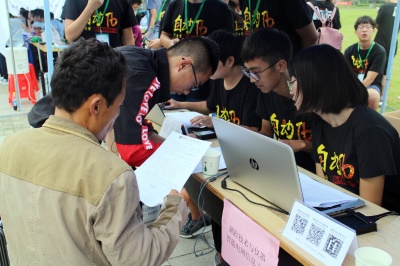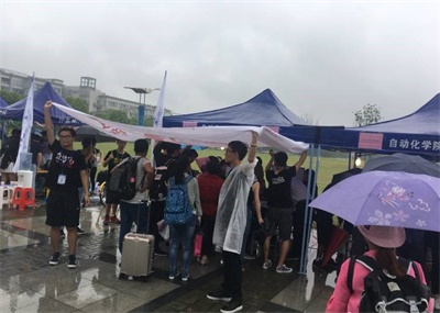 6号下午,夏末秋初的石城金陵,下起了大雨,但是全体迎新同学积极主动、热情大方的工作态度却始终如一,他们用双手撑起了“人工帐篷”,为新生及其家长打造一个最为舒适的注册环境,得到了新生家长的一致好评。