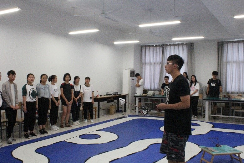 随后,范亭中学的师生们来到了18jav 、人工智能学院学科楼,分别对科协社团和阿波罗社团的实践基地进行参观。两个社团的成员向范亭中学的师生们分别展示了智能小车和智能机器人并对其运行原理进行了简明扼要的讲解。在观看电磁小车沿赛道运行时,高中生们流露出了非常浓厚的科创兴趣,他们对小车和机器人的制作与运行提出了相关问题,对此,18jav 、人工智能学院的同学们依据自己所学的知识一一进行了详细的解答。