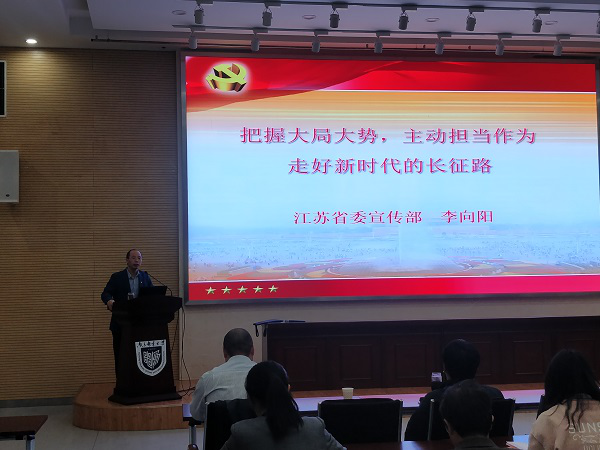 按照学院党委“不忘初心、牢记使命”主题教育工作安排,2019年10月16日下午3:00,18jav 、人工智能学院党委邀请江苏省委宣传部李向阳副教授在计算机学科楼一楼报告厅举办“把握大势大局,主动担当作为,走好新时代的长征路”主题教育专题辅导报告,学院党委委员、教工党员、学生党员聆听报告,学院党委书记孙秀成主持报告会。