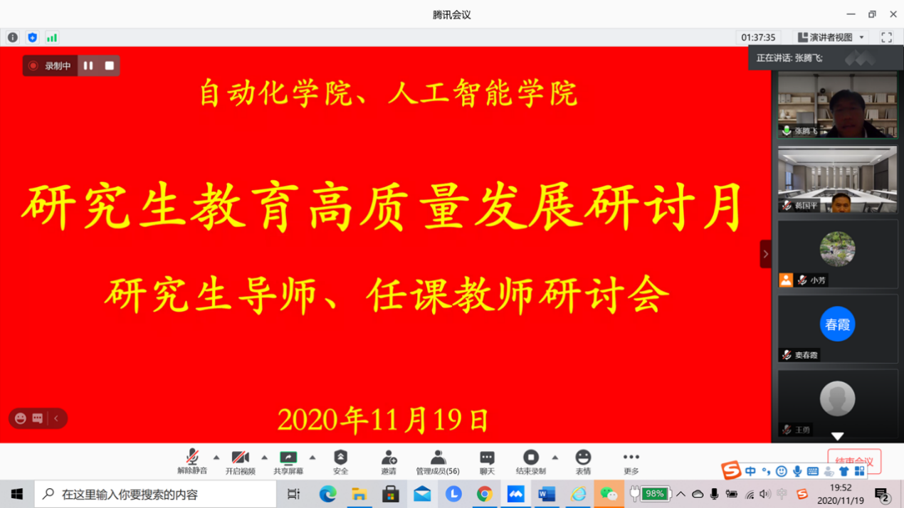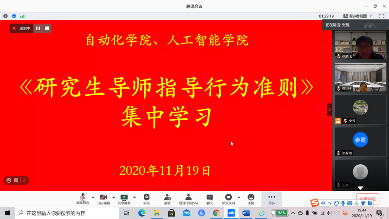 2020年11月19日,学院通过腾讯会议组织全体研究生导师集中学习《研究生导师指导行为准则》,并组织召开研究生导师、任课教师研讨会。蒋国平副校长、学院张翼书记出席会议,学院研究生导师和任课教师参会。