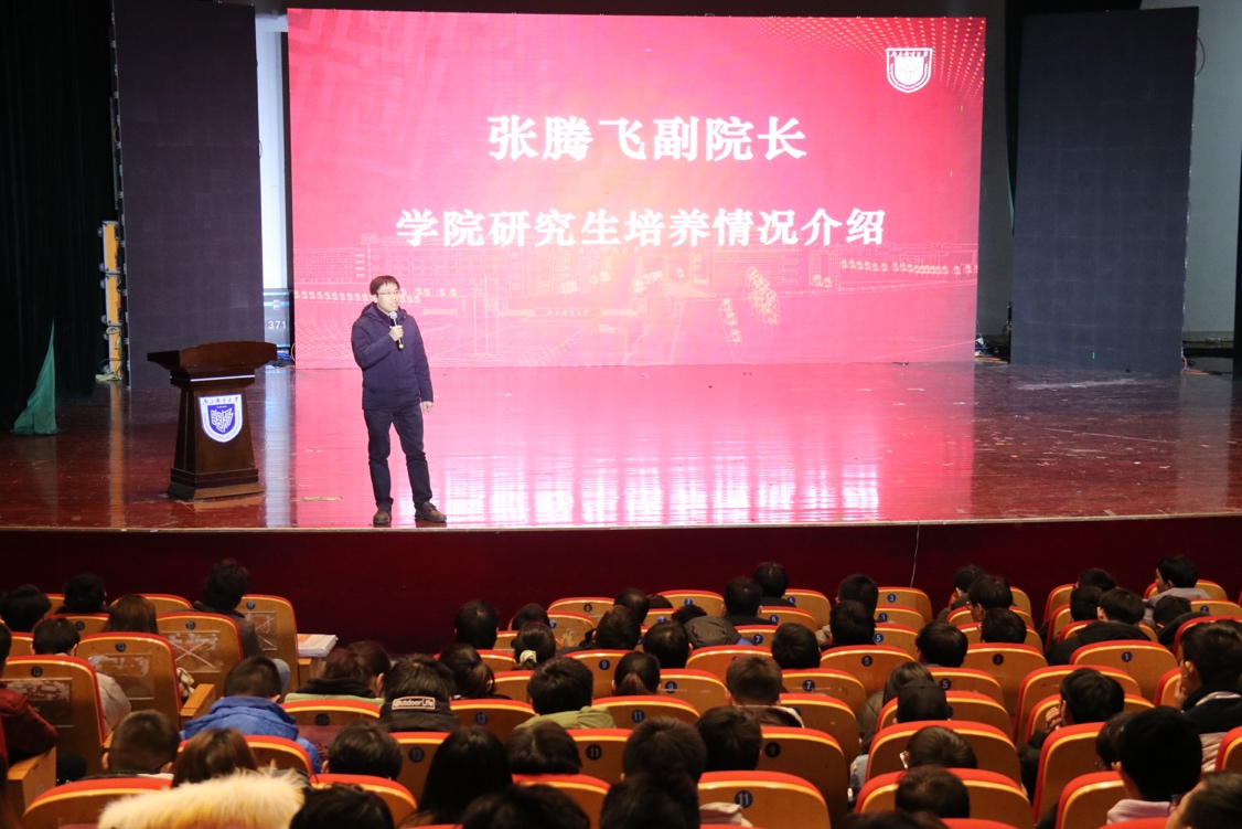 随后,张腾飞院长向同学们介绍学院研究生培养情况。张院长表示研究生阶段更注重综合素质的培养,鼓励同学们本科期间打好专业基础,根据自身规划与自身能力合理选择院校。同时,张院长强调了“坚持”对于考研的重要性,希望在座学子在选择考研后明确目标、尽早规划并持之以恒。