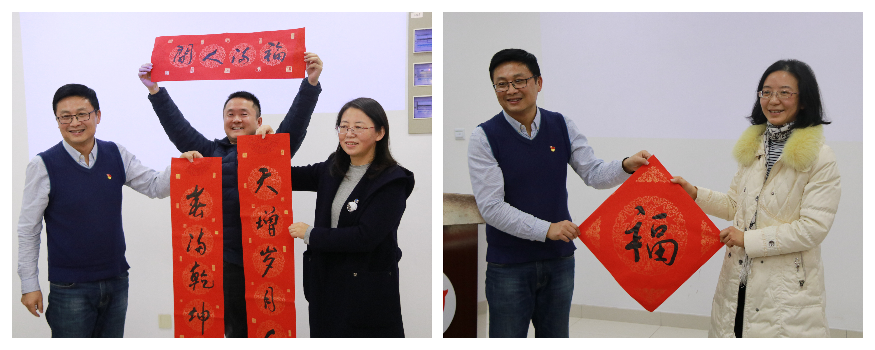 恰逢学院召开第二届教职工代表大会暨工会会员代表大会第三次会议,学院党委书记张翼现场挥毫,为教职工书写春联、福字,苍劲老道的行草映衬在洒金红宣纸上显得赏心悦目。本次活动所有春联、福字,均由陈迪生副书记代表工会,分发给学院教职工。
