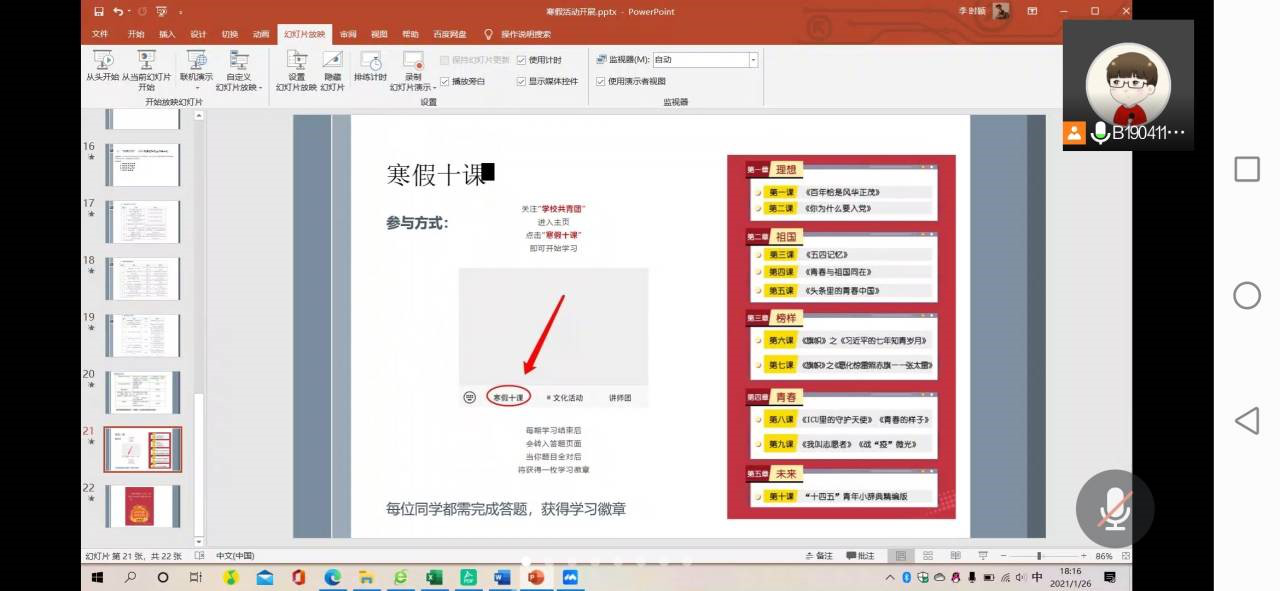 “寒假十课”共分为五个章节:理想、祖国、榜样、青春、未来。每一章节下设二至三小节,内容详实,主题鲜明,短短几分钟却涵盖了共青团员、中共党员的理想滋养、“一集正三观”的硬核知识以及热血沸腾的动人故事,鼓舞同学们“青春正当时,无悔追梦人。”