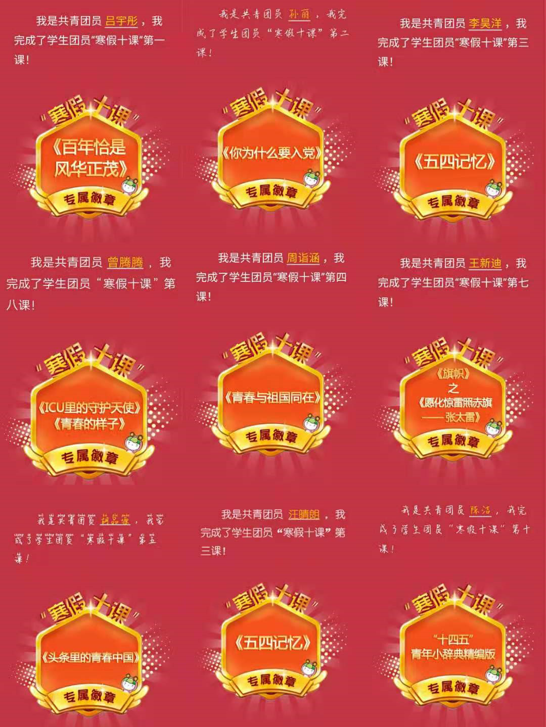 各团支部结合实际情况联合开展了“徽章荣誉墙”比拼活动,激发青年团员竞争学习的热情,鼓励青年团员广泛参与活动。部分团支部依托“寒假十课”为主要学习资料进一步丰富学习内容,深化学习内涵,通过在线会议等形式开展了团支书讲团课、“‘十课’热点我有话”等线上活动,充分调动了青年团员学习热情,引导青年团员在学习中思考。