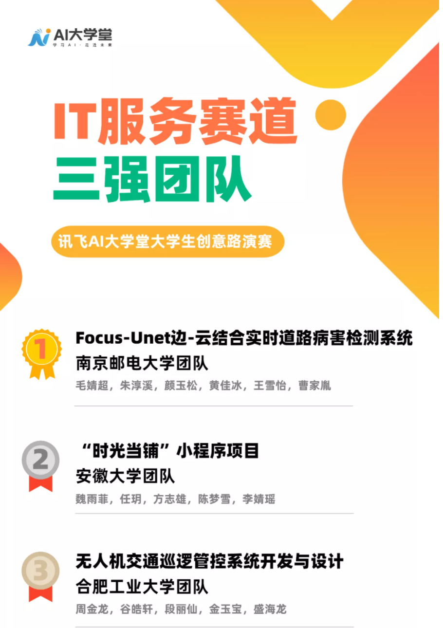 10月24日,讯飞AI大学堂大学生创意路演赛于合肥开幕启动,历经一个月的线上人气比拼,讯飞AI大学堂大学生创意路演赛IT服务、工业智能、智慧农业、智慧医疗、创新生活五大赛道的三强队伍均已产生,18jav “Focus-Unet边-云结合实时道路病害检测系统”以超高票数从众多项目中脱颖而出,获得IT服务赛道第一名。