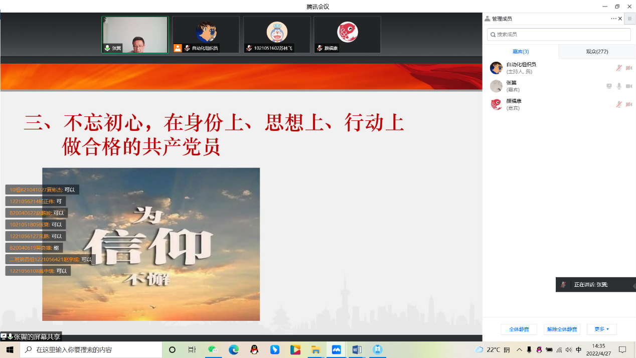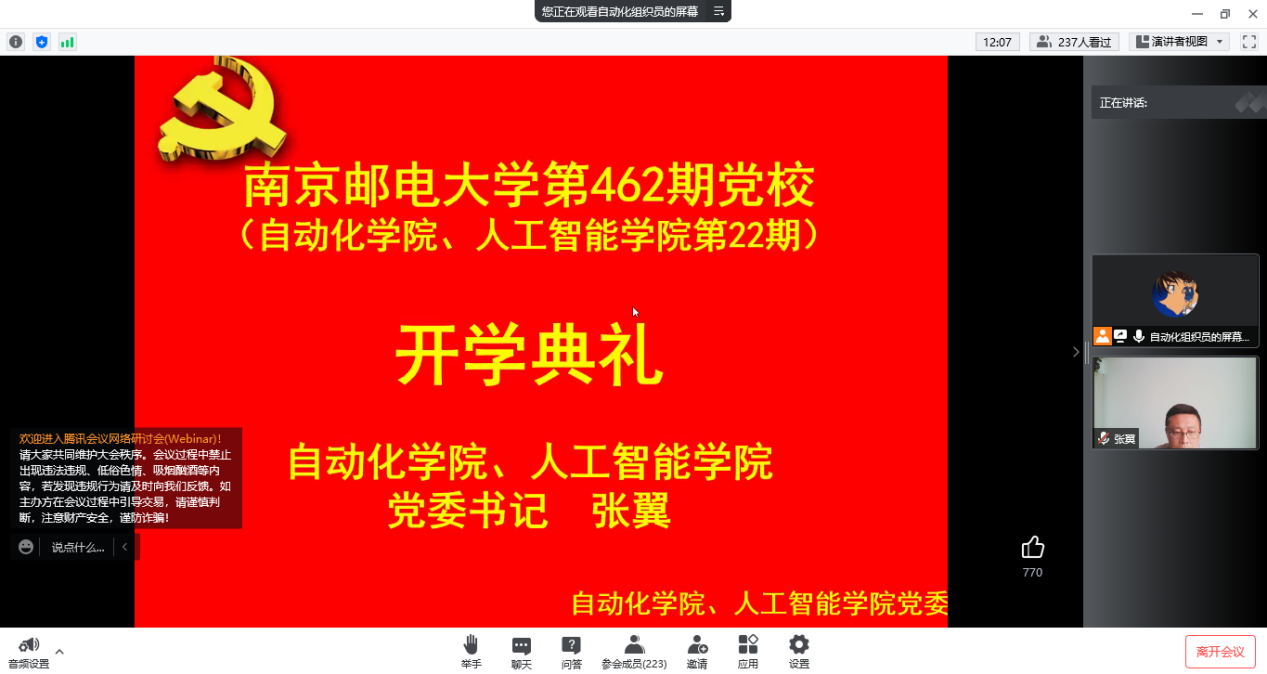 2022年4月27日,18jav 第462期暨18jav 、人工智能学院第22期入党积极分子党校培训班顺利开班。学院党委深入学习贯彻习近平总书记关于疫情防控的重要指示精神,坚决落实中央、省委疫情防控决策部署和校党委具体要求,本期培训班教学活动采用线上形式举行,由18jav 、人工智能学院党委书记张翼主持。