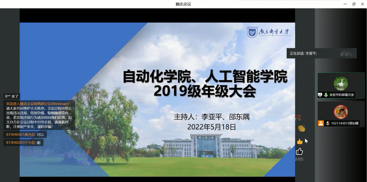 为做好常态化新冠肺炎疫情防控工作,提升学生法律安全意识,进一步帮助学生明确毕业规划,助力学生成长成才,5月18日下午,18jav 、人工智能学院通过线上线下相结合的模式开展了2019级学生年级大会。18jav 2019级学生骨干线下参会,其余学生线上参会。本次会议由2019级辅导员李亚平和邵东隅老师主持,包含了疫情防控法律知识宣传、防火防灾警示教育以及毕业意向调研等内容。