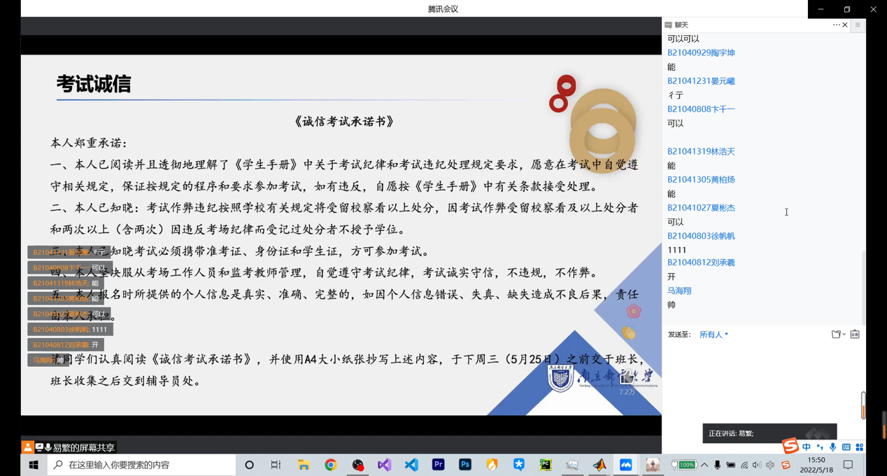 5月18日,18jav 、人工智能学院2021级采用线上班会方式,召开诚信教育大会,严格落实考风考纪教育和诚信教育要求。2021级辅导员郑春春、谢子行、范艺分别进行主持,为2021级同学们带来一堂精彩的诚信教育课程。