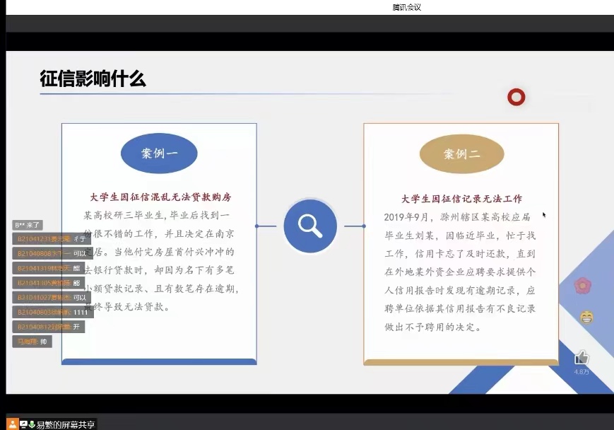 2021级新生诚信教育从三个方面展开:金融征信、发生在身边的电信诈骗以及诚信考试。大一新生许多都是刚刚离开家庭,独自在外求学,对于金融征信等的知识和了解较为欠缺。本次教育以实际案例为引,深入浅出的向学生讲述了征信的重要性和不良校园贷的危害。接下来,辅导员们以本学期同学们所接触到的电信诈骗为例子,解析了诈骗过程中诈骗者的一些惯用手段和预防措施。同时辅导员反复提醒同学,诈骗的手段总是在不断变化,防不胜防,因此不转账、不下载陌生APP、不给予其他人自己的个人信息等底线一定要守牢。