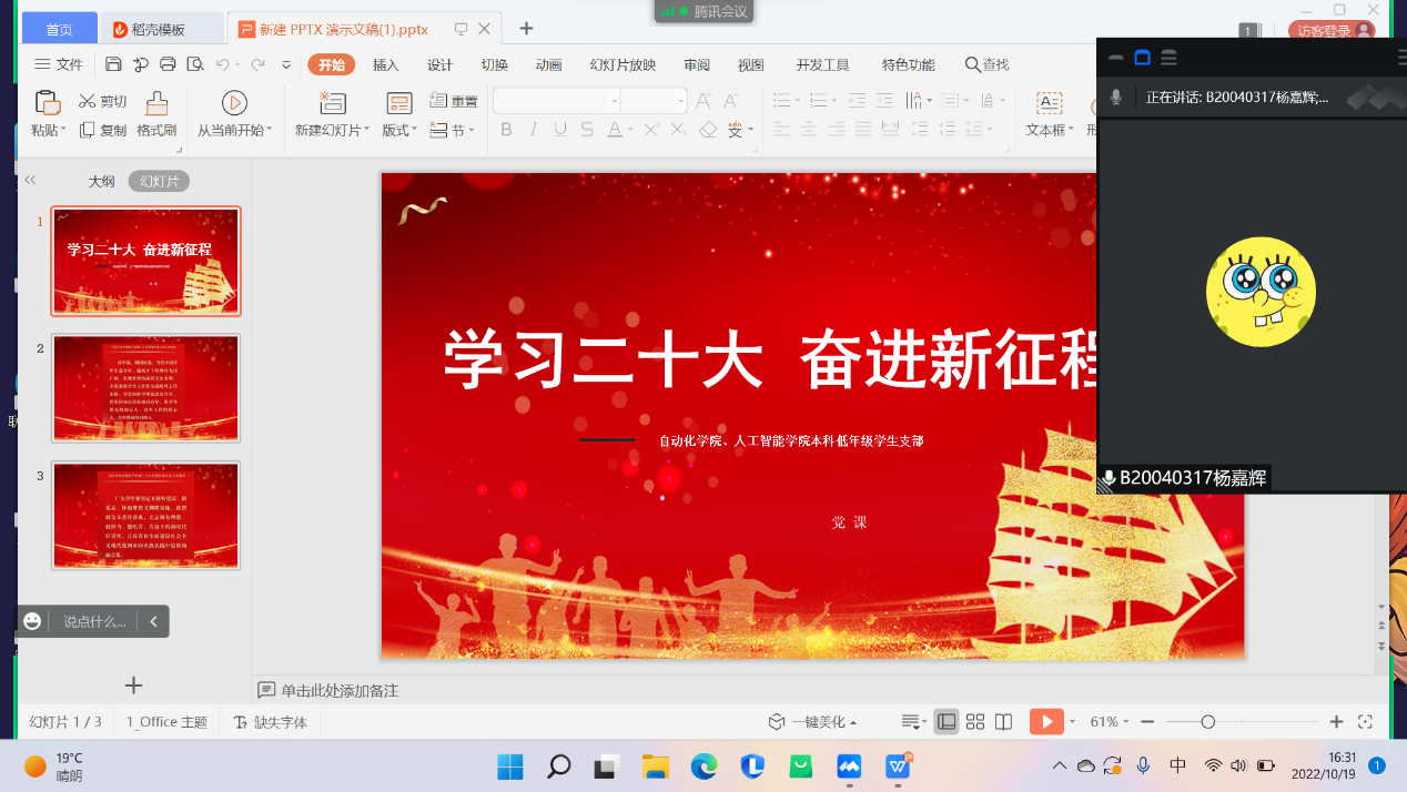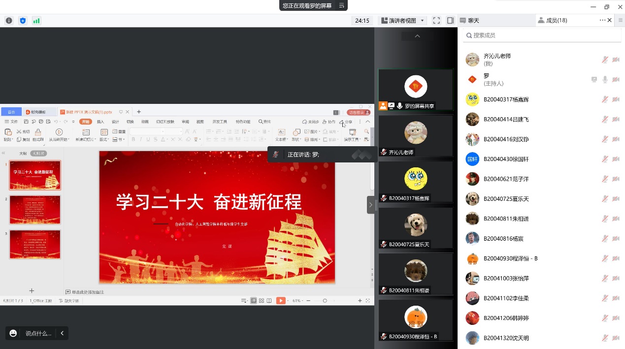 为深入学习和领会党的二十大精神,10月19日下午,学院以支部书记讲党课的形式为本科低年级学生党员开展线上学习会。会议由支部书记罗帅老师主持,学院党委副书记、副院长孙委委和低年级辅导员缪甜佳、蔡雪、齐沁儿及支部学生参加会议。