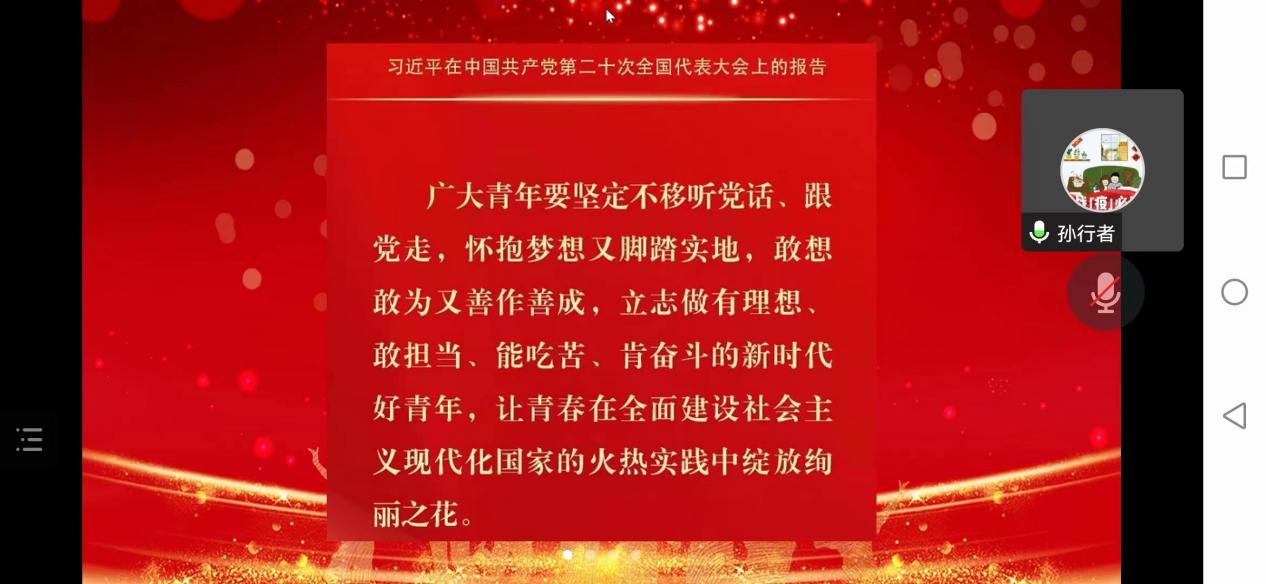 孙委委副书记带领支部成员重温了习近平总书记对新时代青年的寄语:“广大青年要坚定不移听党话、跟党走,怀抱梦想又脚踏实地,敢想敢为又善作善成,立志做有理想、敢担当、能吃苦、肯奋斗的新时代好青年,让青春在全面建设社会主义现代化国家的火热实践中绽放绚丽之花”。同时,孙委委副书记号召支部全体成员,紧跟党的步伐,深入学习贯彻党的二十大精神,切实把思想和行动统一到党的二十大精神上来,要继续为“强国梦”添砖加瓦,以实际行动贯彻党的二十大精神。