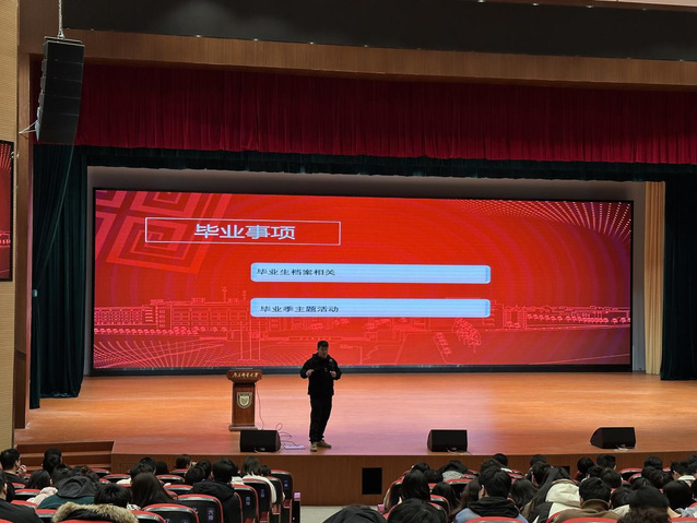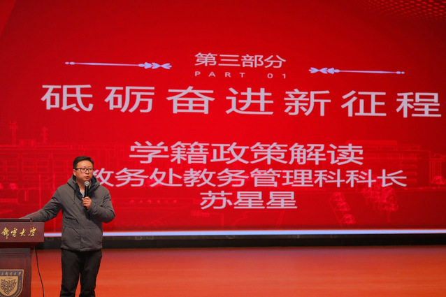 教务管理科科长苏星星为同学们进行学籍政策方面的解读,讲述临近毕业的几个月学籍相关方面的问题,包括毕业资格审核,大四重修课程,自主化学分是否达标以及能否满足毕业要求等。最后,苏星星科长强调诚信考试,走好本科阶段的最后一步,对自己负责,重视毕业设计,充分利用时间,希望大家都能顺利毕业!