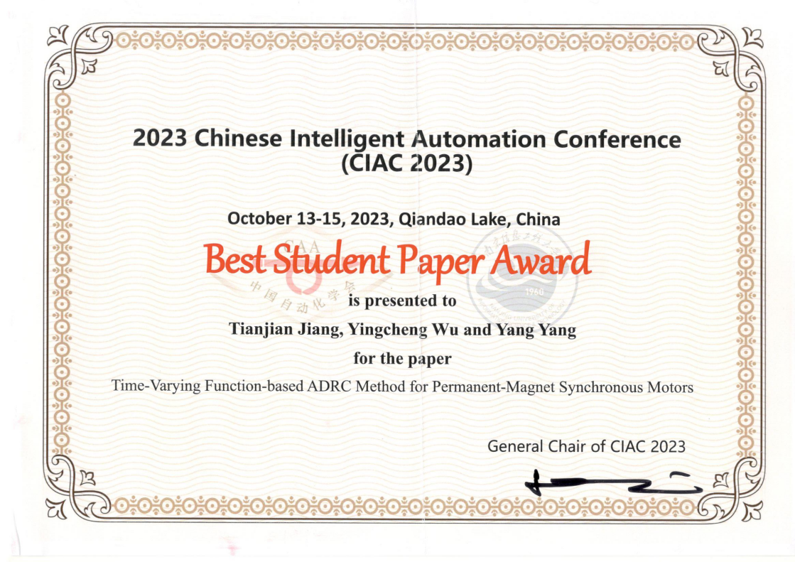 18jav 杨杨教授指导的智能科学与技术专业2020级本科生蒋天健论文《Time-Varying Function-Based ADRC Controller for Permanent-Magnet Synchronous Motors》经大会评审,被评选为会议唯一的最佳学生论文奖(Best Student Paper Award)。