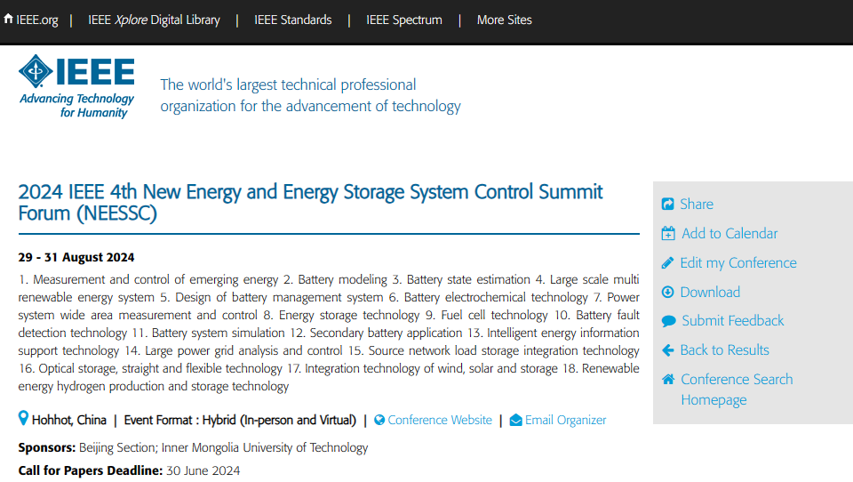 第四届新能源与储能系统会议暨第一届IEEE PES智能电网与新技术委员会(中国)年会将于2024年8月29日至31日在中国内蒙古呼和浩特召开,由内蒙古工业大学、西南科技大学、IEEE北京分会 、IEEE PES智能电网与新技术委员会(中国)、中国科学技术大学、四川大学、电子科技大学、西南交通大学、成都信息工程大学、国家工信部创新成果产业化公共服务平台、中国仿真学会仿真技术应用专业委员会、中国自动化学会新能源与储能系统控制专委会联合主办,由内蒙古工业大学电力学院、智慧储能研究院、大规模储能技术教育部工程研究中心、内蒙古能源战略研究中心联合承办。