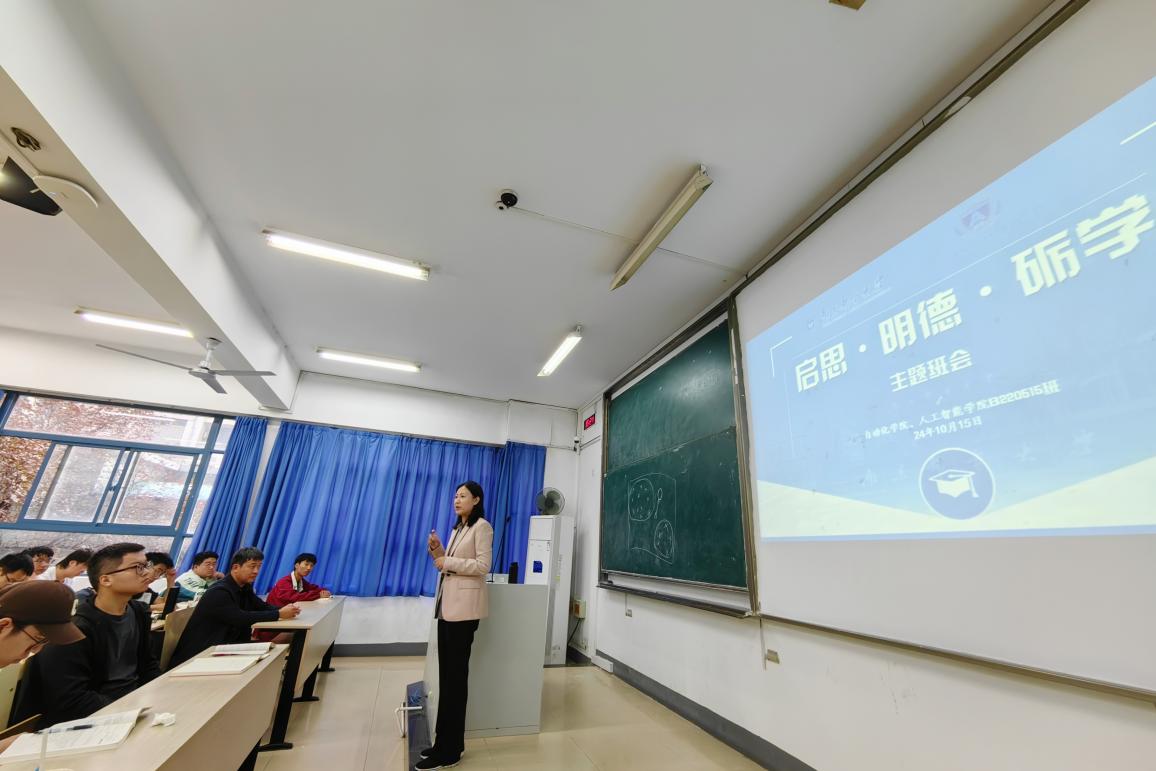为落实立德树人根本任务,深化三全育人格局,畅通学校与学生的沟通渠道,落实“三进三谈三联”工作制度,做好“进百班、入千室、访万生”大走访活动,营造良好学风,迎接本科教育教学审核性评估,10月15日下午,校党委常委、宣传部部长张敏走进18jav 、人工智能学院B220515班,和学院党委副书记孙委委、带班辅导员齐沁儿一起,深入课堂和班级,了解同学们常态化的学习状况,并为同学们开设了一场别开生面的“启思·明德·砺学”主题教育微班会。