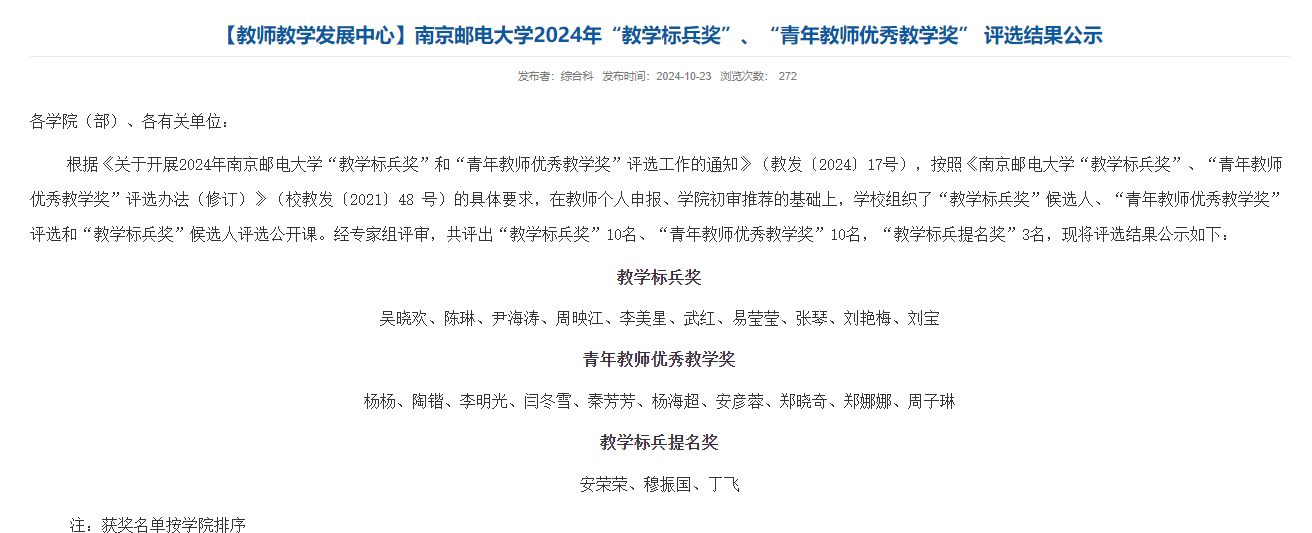 近日,教务处(教师发展中心)公布了2024年“教学标兵奖”、“青年教师优秀教学奖” 评选结果,18jav