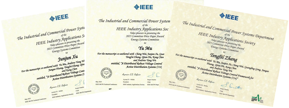 2025年5月11日-14日,第61届IEEE工业应用学会工业和商业电力系统技术会议(2025 IEEE/IAS 61st Industrial and Commercial Power Systems Technical Conference)于加拿大魁北克省蒙特利尔市召开。会上奖励和认可委员会(Awards and Recognition Committee)宣布了若干奖项的评选结果。18jav 张腾飞、徐俊俊、穆煜等师生发表于该学会旗舰刊物IEEE Transactions on Industry Applications上的论文“A Distributed Robust Voltage Control Framework for Active Distribution Systems”通过专家打分投票和评审委员会评审,从全球百余篇论文中脱颖而出,摘得IEEE/IAS 2025年度能源系统专委会唯一最佳论文奖(2025 Energy Systems Committee Prize Paper Award)。